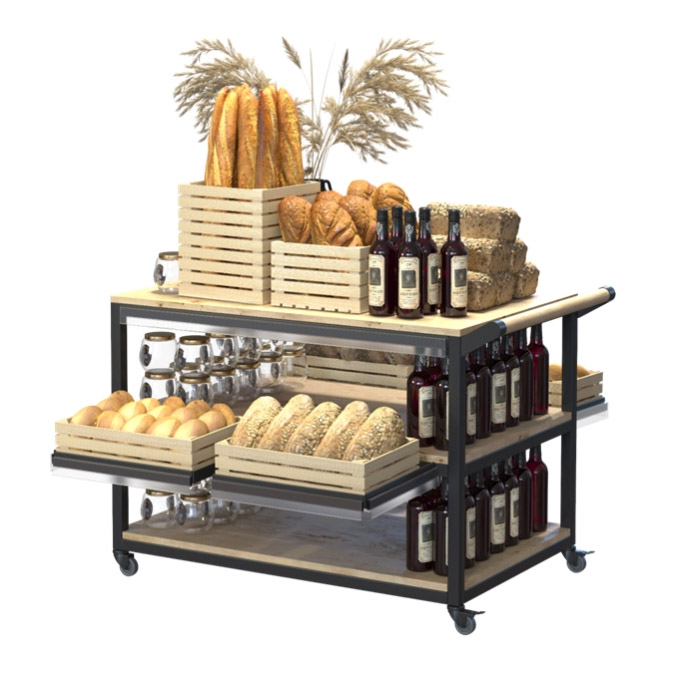 Хлібний стелаж металевий різноманітними полицями на коліщатках
