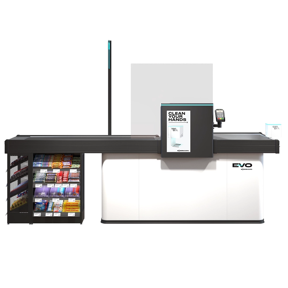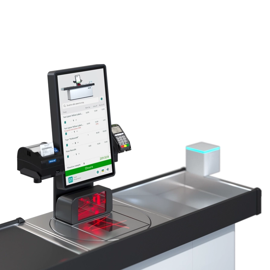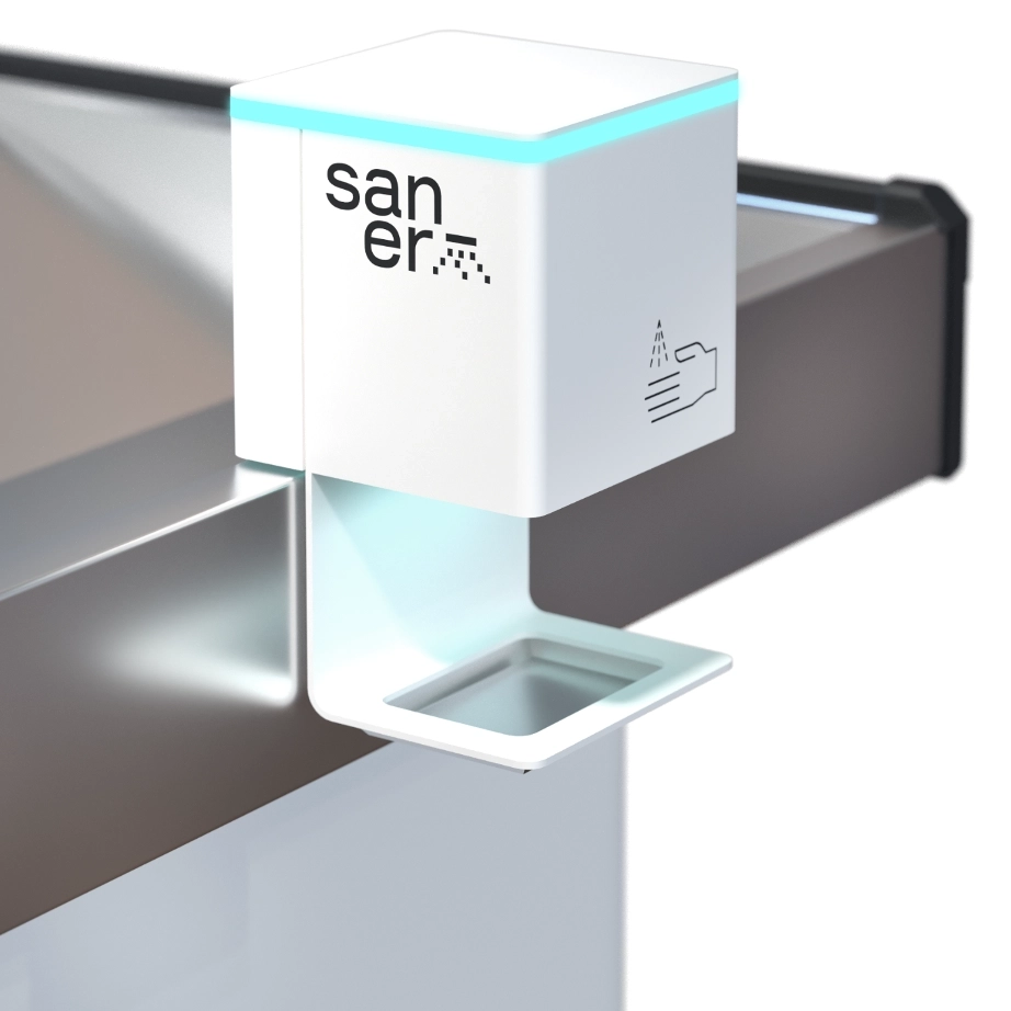 • Пункт для дезінфекції – наш новий Санер-Піксель, що створений на базі існуючого рішення Санер , модифіковане  та зменшене в габаритах як для інтеграції з касовим боксом, так і для більш комфортних покупцю розмірів саме для такого розміщення.