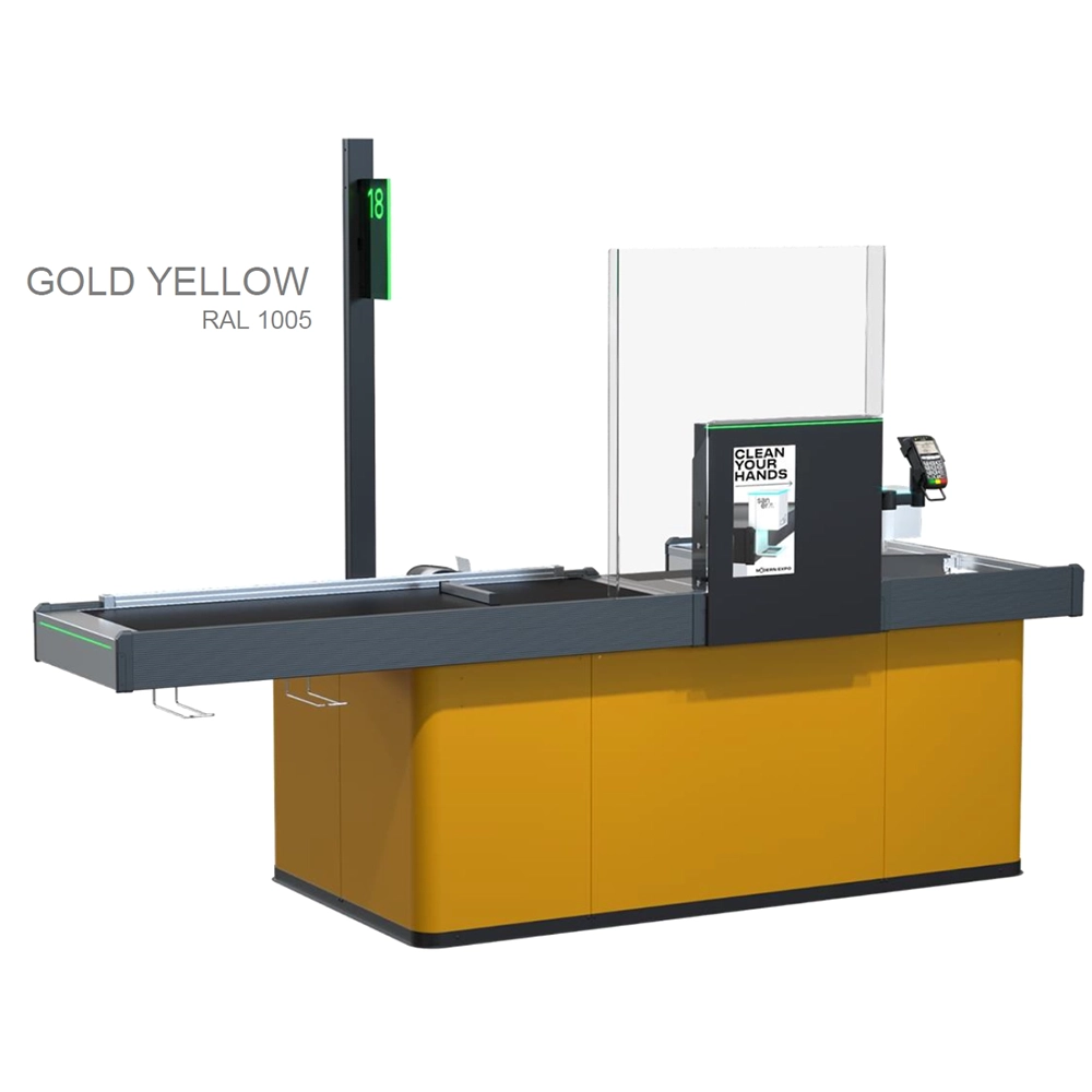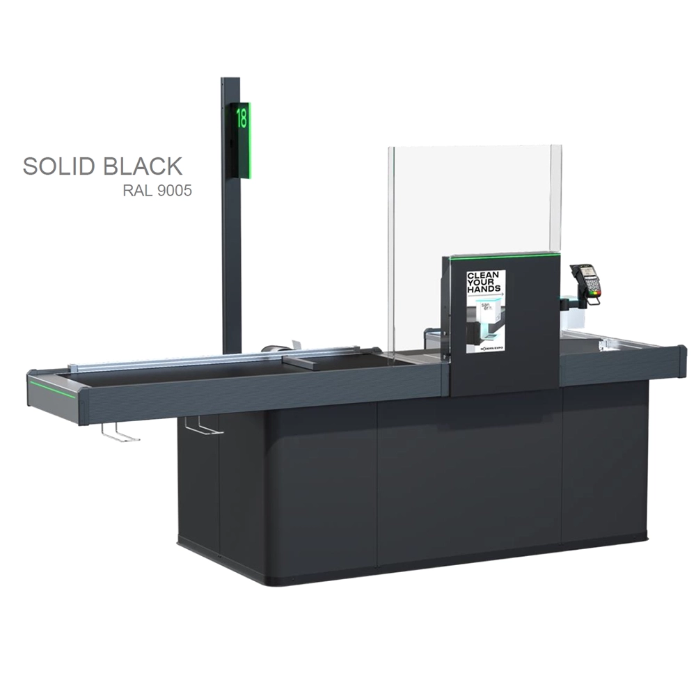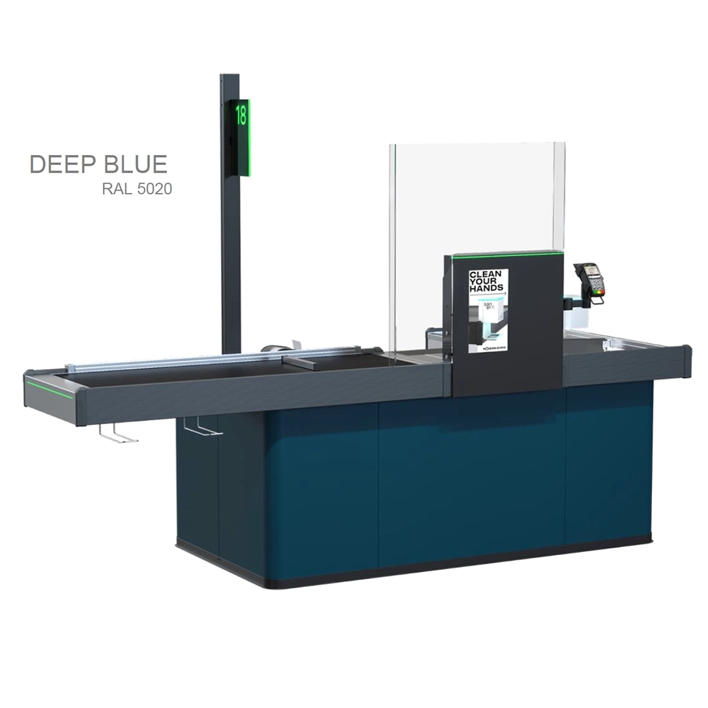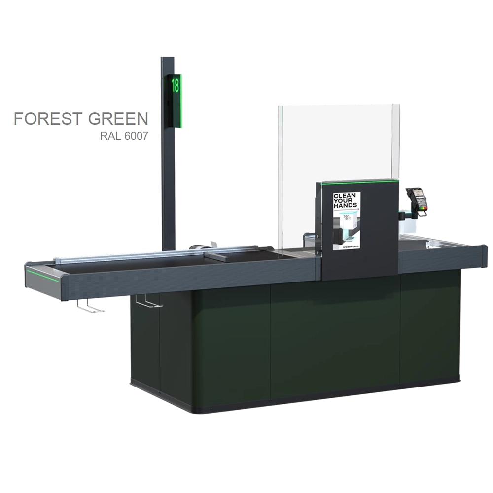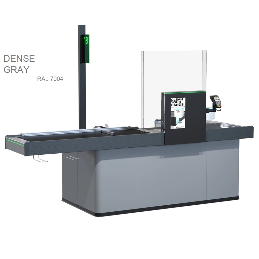 Робоче місце. Ширина 550мм. На основі нашого досвіду та аналізу потреб ринку, ми прийшли до висновку що майже 80% клієнтів повністю задоволені таким рішенням. Воно відповідає ергономічним нормам для нормальної роботи касира. Водночас воно вирішує всі необхідні питання для збалансованої роботи касира та інтеграції IT-обладнання. Використання захисту сканера та / або ергономічних стійок з тримачами вирішують 80% усіх питань пов’язаних із розміщенням додаткового обладнання. Усі наведені вище розміри чітко вказують на можливість мультиформатного використання модульних касових боксів цього  типу. Окремої уваги вартує бампер з ПВХ, який має цікаву поверхню у вигляді хвиль. Це не лише дизайн – така форма зменшує ризик пошкодження. Крім того, він виготовлений з двох частин – основного відбійника з використанням двох різних ПВХ – для отримання необхідної товщини частини, що кріпиться до сталевої деталі КБ звичайними заклепками. Все це приховується другою частиною – середньою вставкою, яка за принципом форми та способу кріплення “клік” ідеально підходить для швидкої заміни при потребі. Крім того, потенційно, ми можемо використовувати середню вставку у іншому кольорі.