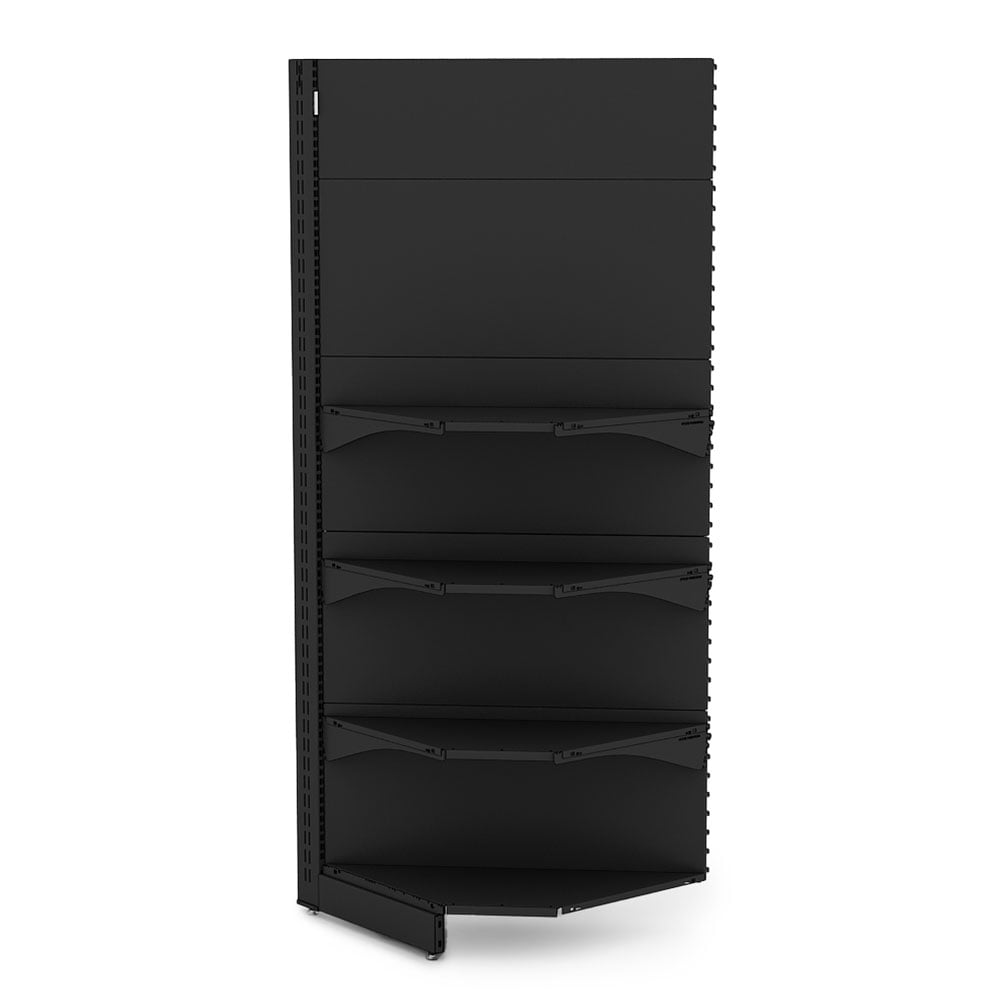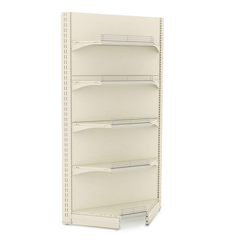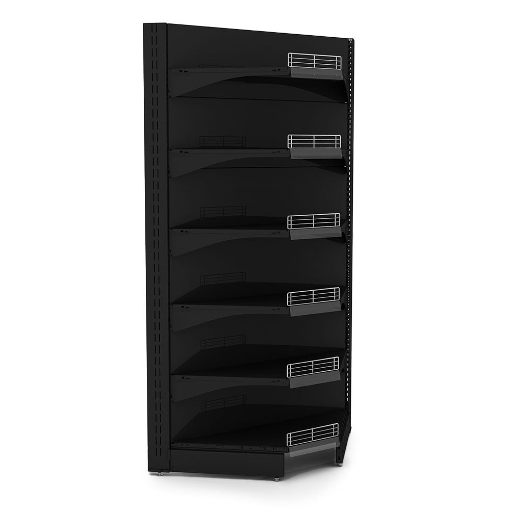 Кутові торгові стелажі також включають посилені системи полиць і два профілі, систему click-clack для механічної самофіксації полиці на кронштейнах, і спеціальну систему фіксації задньої стінки на нозі для збільшення загального навантаження на стелаж. Завдяки вузькому профілю полиці та дюймовому кроку перфорації можна розміщувати відразу дві полиці на рівні очей покупця, а перфорація стійки з кроком 25 мм дозволяє виставляти більшу кількість товару на одній і тій же площі стелажу по висоті.