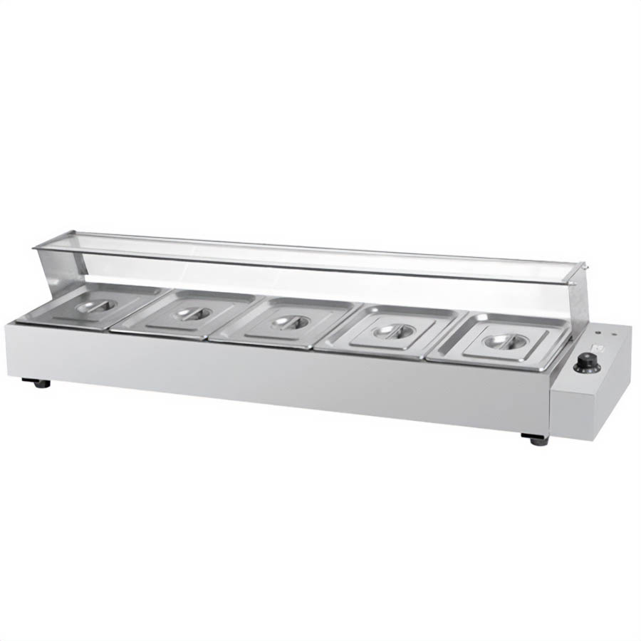 Настільний марміт-вітрина на 5 гастроємності GN 1/2 х 100 мм дозволяє наочно демонструвати страви, надаючи покупцеві максимальний огляд. Персонал має зручний доступ до страв, що виставляються. Розігрів їжі здійснюється парою. Паровий марміт забезпечує м’ягке та рівномірне нагрівання їжі. Корпус, кришка та ємність із нержавіючої сталі. Марміт укоплектоварн скляною вітриною. Гастроємності та кришки в комплекті.