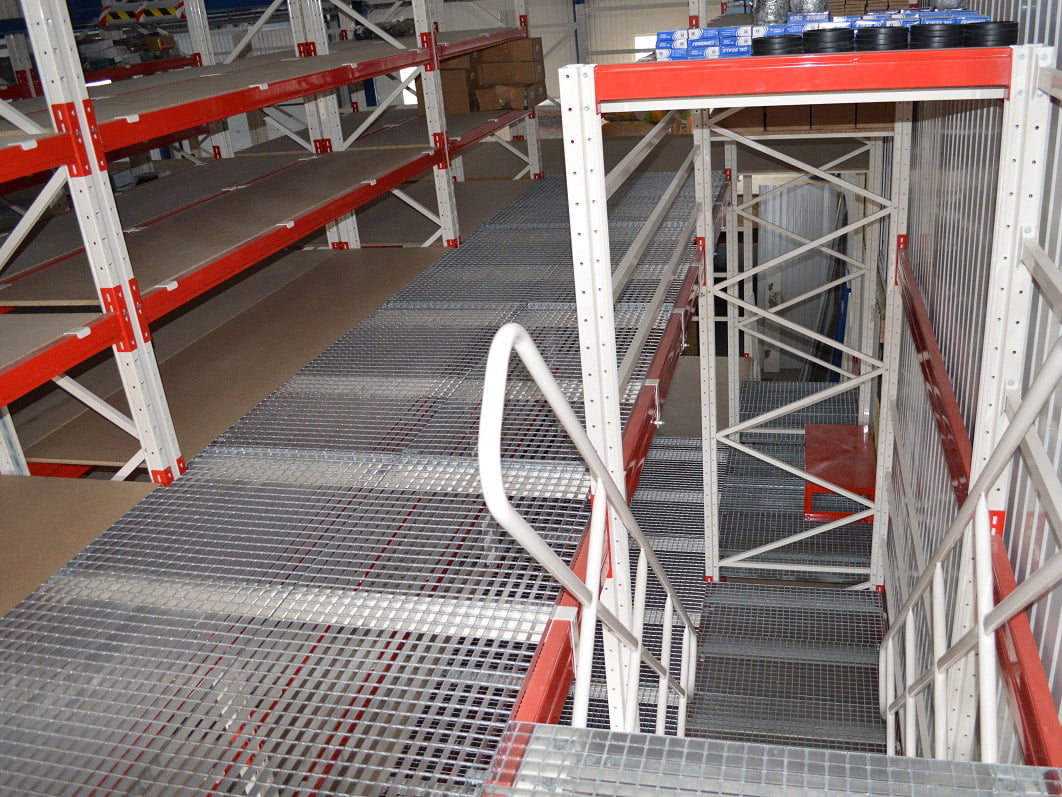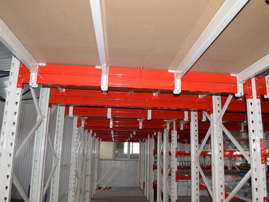 Подібна система має найскладнішу конструкцію. Вона складається з несучих опор, міжрівневого настилу, різних перегородок, сходів та воріт. Несуча здатність одного квадратного метра такої складської системи здатна досягати кількох тон. Кожен із ярусів такого мезоніну може використовуватися для підлогового складування вантажу на палетах.