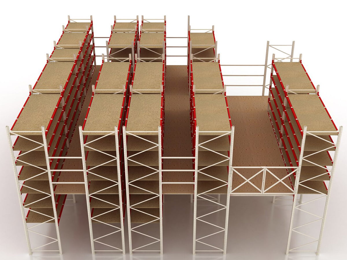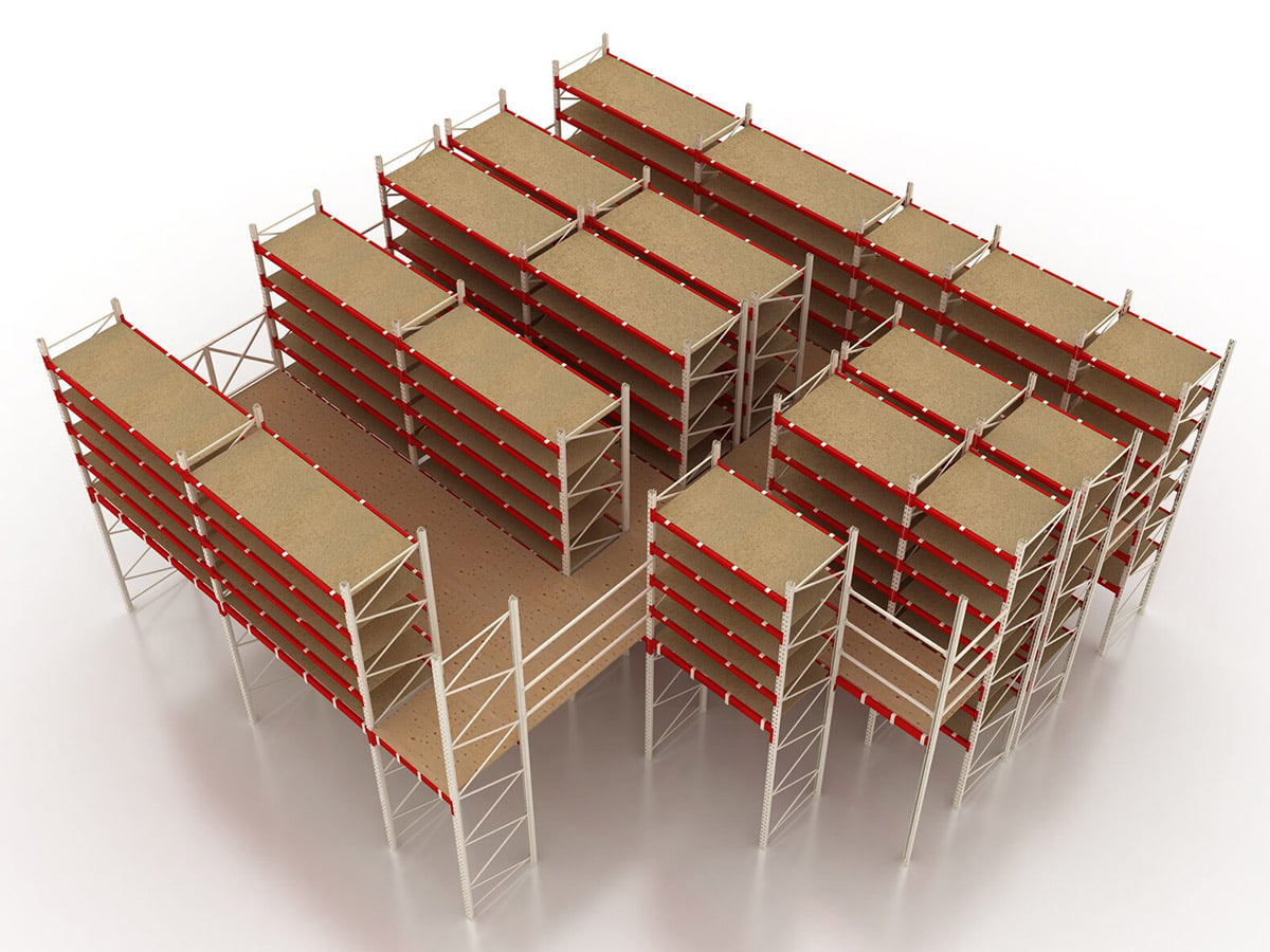 Штабелювання товарів у мезонінних стелажах може бути організоване як з полицями, так і без них. Щоб організувати полиці, вставте між опорними рамами спеціальні балки і покладіть на них підлоговий матеріал. Якщо полиці не потрібні, розділіть простір в системі зберігання на яруси і зберігайте товари на стандартних полицях або підлозі. Перед придбанням мезонінних стелажів бажано ознайомитися з усіма елементами цієї складної, багатоярусної системи.