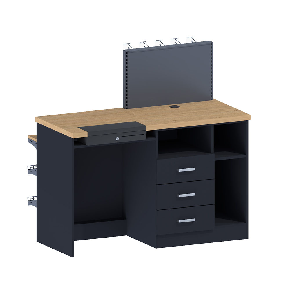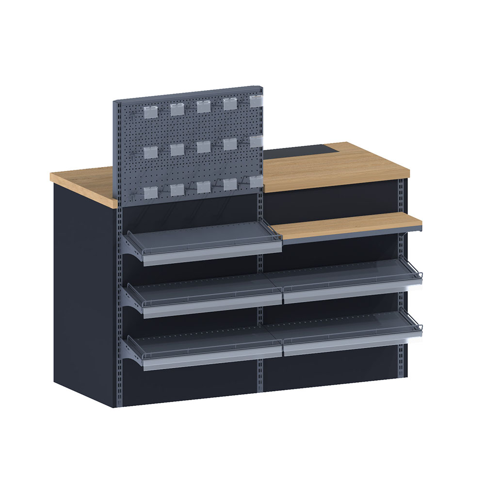 Розрахункова касова зона поєднує в собі касовий бокс та стелаж з полицями для презентації товару. Найбільш популярною локацією використання цього обладнання є автомобільні заправні станції, де важливо надати максимально швидке та якісне обслуговування. По обидва боки острова на полицях з ДСП можна зберігати і представляти харчові продукти, напої, сувеніри та інше. У той же час наявність вбудованого касового боксу і додаткового обладнання у вигляді навісних стендів і модулів робить розрахункову зону дуже функціональною.
