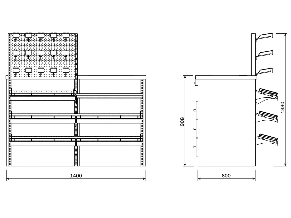 SKK721.000.002-00 A M Кронштейн універсальний боковини ДСП (7016 ш.п) – 2 шт, Грошовий ящик – 1 шт, КМ БР 30 665 Бар'єр (7016 ш.п) – 7 шт, КМ ВСО Ц 4 150 Вішак на перфоровану стінку з цінникотримачем (zink) – 15 шт, КМ КР ДСП ПР 200 Пара кронштейнів полиці ДСП (7016 ш.п) – 1 шт, КМ КРУ 200 Кронштейн універсальний (7016 ш.п) – 14 шт, КМ ПГ 40 665 МО Покрива гондоли одинарна (7016 ш.п) – 1 шт, КМ ПП 200 665 Полиця підсилена (7016 ш.п) – 7 шт, КМ ППЛ 30 300 Перегородка (7016 ш.п) – 8 шт, КМ СТ 02 450 665 Стінка задня (7016 ш.п) – 1 шт, КМ СТП 02 450 665 Стінка задня перфорована (7016 ш.п) – 1 шт, КМ ЧП ФК 40 1320-2 Нога передняя – 2 шт, КМ ЧП ФК 40 864-2 Нога передняя – 1 шт, Планка цінова для гачка, 39*66 мм, діам.дроту 6-8 мм, прозора – тримач цінника VH39-66 – 15 шт, Тумба 1 шт, Цінник для полиці MOEKS , відкидний, прозорий H39 L653 мм,ПВХ – 7 шт