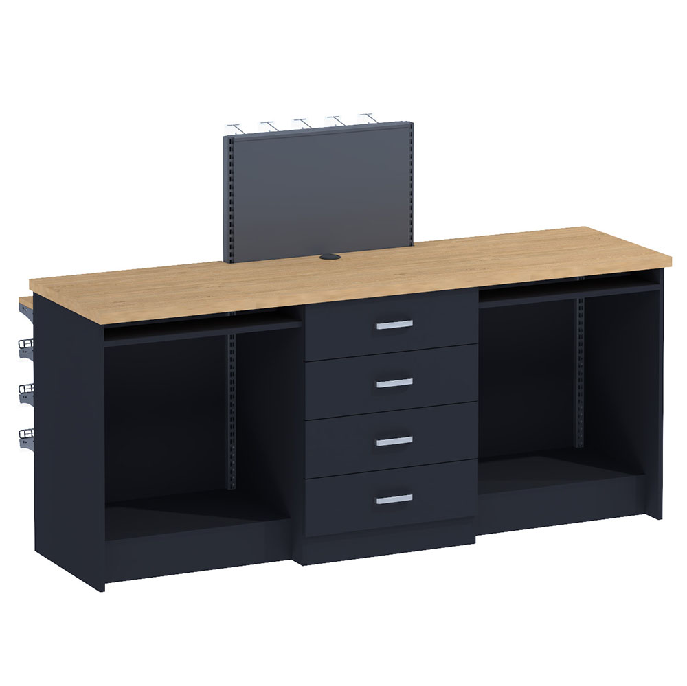 Розрахункова касова зона поєднує в собі касовий бокс та стелаж з полицями для презентації товару. Найбільш популярною локацією використання цього обладнання є автомобільні заправні станції, де важливо надати максимально швидке та якісне обслуговування. По обидва боки острова на полицях з ДСП можна зберігати і представляти харчові продукти, напої, сувеніри та інше. У той же час наявність вбудованого касового боксу і додаткового обладнання у вигляді навісних стендів і модулів робить розрахункову зону дуже функціональною.