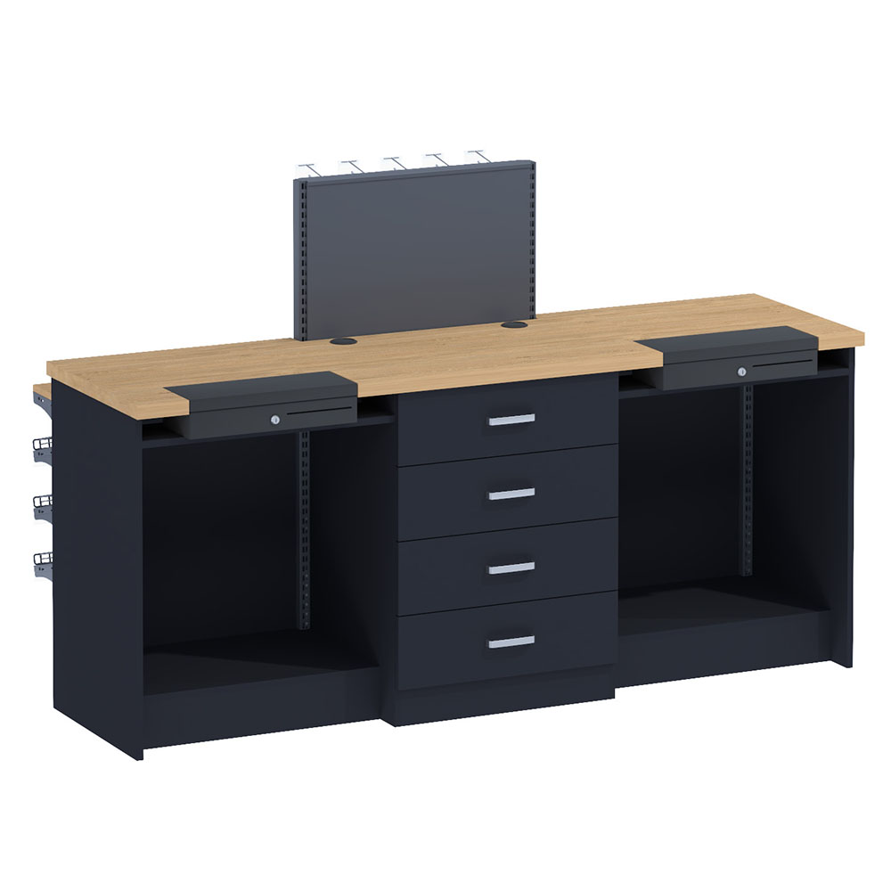 Розрахункова касова зона поєднує в собі касовий бокс та стелаж з полицями для презентації товару. Найбільш популярною локацією використання цього обладнання є автомобільні заправні станції, де важливо надати максимально швидке та якісне обслуговування. По обидва боки острова на полицях з ДСП можна зберігати і представляти харчові продукти, напої, сувеніри та інше. У той же час наявність вбудованого касового боксу і додаткового обладнання у вигляді навісних стендів і модулів робить розрахункову зону дуже функціональною.