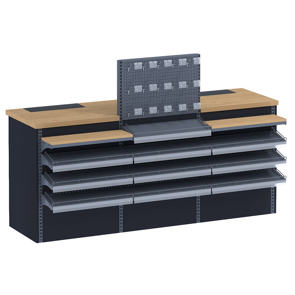 Грошовий ящик – 2 шт, КМ БР 30 665 Бар'єр (7016 ш.п) – 10 шт, КМ ВСО Ц 4 150 Вішак на перфоровану стінку з цінникотримачем (zink) – 15 шт, КМ КР ДСП ПР 200 Пара кронштейнів полиці ДСП (7016 ш.п) – 2 шт, КМ КРУ 200 Кронштейн універсальний (7016 ш.п) – 20 шт, КМ ПГ 40 665 МО Покрива гондоли одинарна (7016 ш.п) – 1 шт, КМ ПП 200 665 Полиця підсилена (7016 ш.п) – 10 шт, КМ ППЛ 30 300 Перегородка (7016 ш.п) – 8 шт, КМ СТ 02 450 665 Стінка задня (7016 ш.п) – 1 шт, КМ СТП 02 450 665 Стінка задня перфорована (7016 ш.п) – 1 шт, КМ ЧП ФК 40 1320-2 Нога передняя – 2 шт, КМ ЧП ФК 40 864-2 Нога передняя – 2 шт, Планка цінова для гачка, 39*66 мм, діам.дроту 6-8 мм, прозора – тримач цінника VH39-66 – 15 шт, Тумба 1 шт, Цінник для полиці MOEKS , відкидний, прозорий H39 L653 мм,ПВХ – 10 шт