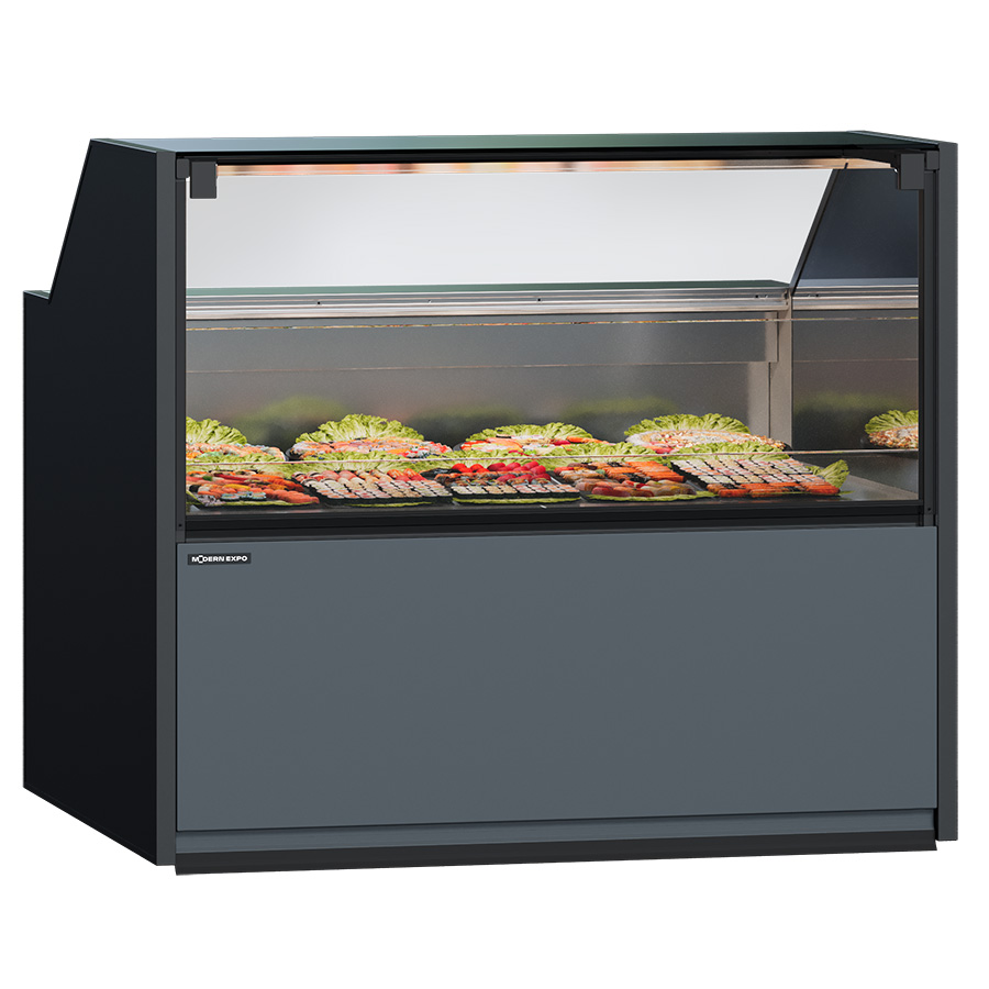 - Матеріал. Корпус вітрини виконаний із високоякісного нержавіючого сталевого листа, а передня панель із міцного скла, що забезпечує відмінне візуальне сприйняття товару та його гігієнічне зберігання.