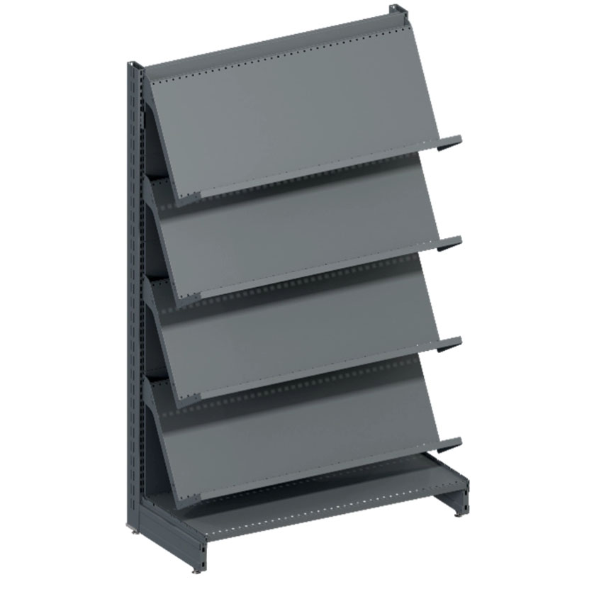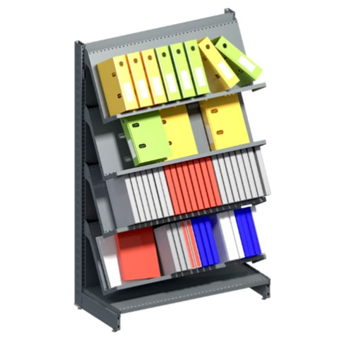 Стелаж надає окремі полиці або відсіки, розташовані під нахилом, які дозволяють легко розділити й організувати канцелярське приладдя зі зручною оглядовістю для покупців.