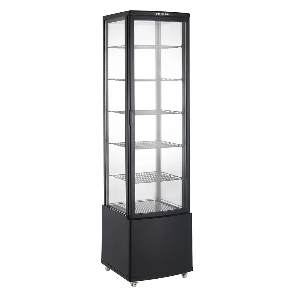 Корпус чорний пластик. Об’єм 280 л. Підлогова кондитерська холодильна вітрина з п’ятью хромованими полицями.