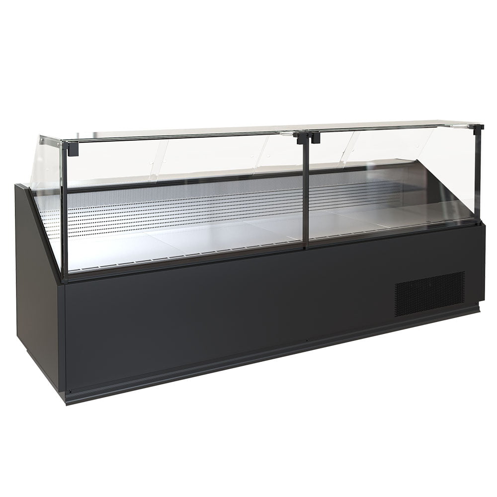 Если же предполагается выкладка насыпной продукции без упаковки — например, мясо, рыба, деликатесы, приготовленные блюда — используется статическое охлаждение. В этом случае поток холодного воздуха мягко подаётся через нижние сопла, не пересушивая продукт и не создавая потоков, способных ухудшить его внешний вид. Такие витрины комплектуются высоким фронтальным стеклом, что создаёт защитную зону от контакта с покупателем. Для удобства обслуживания доступны конфигурации с пневмоподъёмным или откидным стеклом.