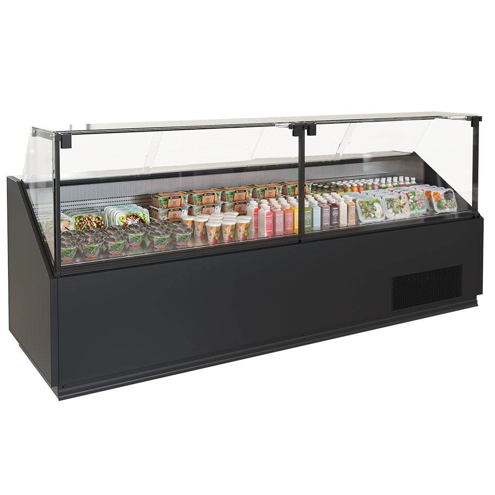 Если витрина предназначена для размещения упакованных товаров в больших объёмах — таких как полуфабрикаты, гастрономия или молочная продукция — предпочтительнее использовать динамическое охлаждение. Встроенный вентилятор обеспечивает равномерную циркуляцию холодного воздуха по всему внутреннему объёму, что позволяет максимально эффективно охлаждать даже плотно уложенный товар. Эти модели, как правило, имеют пониженное фронтальное стекло и ориентированы на самообслуживание покупателей. Витрина Quadros Slim в конфигурации self-service — пример такого решения.