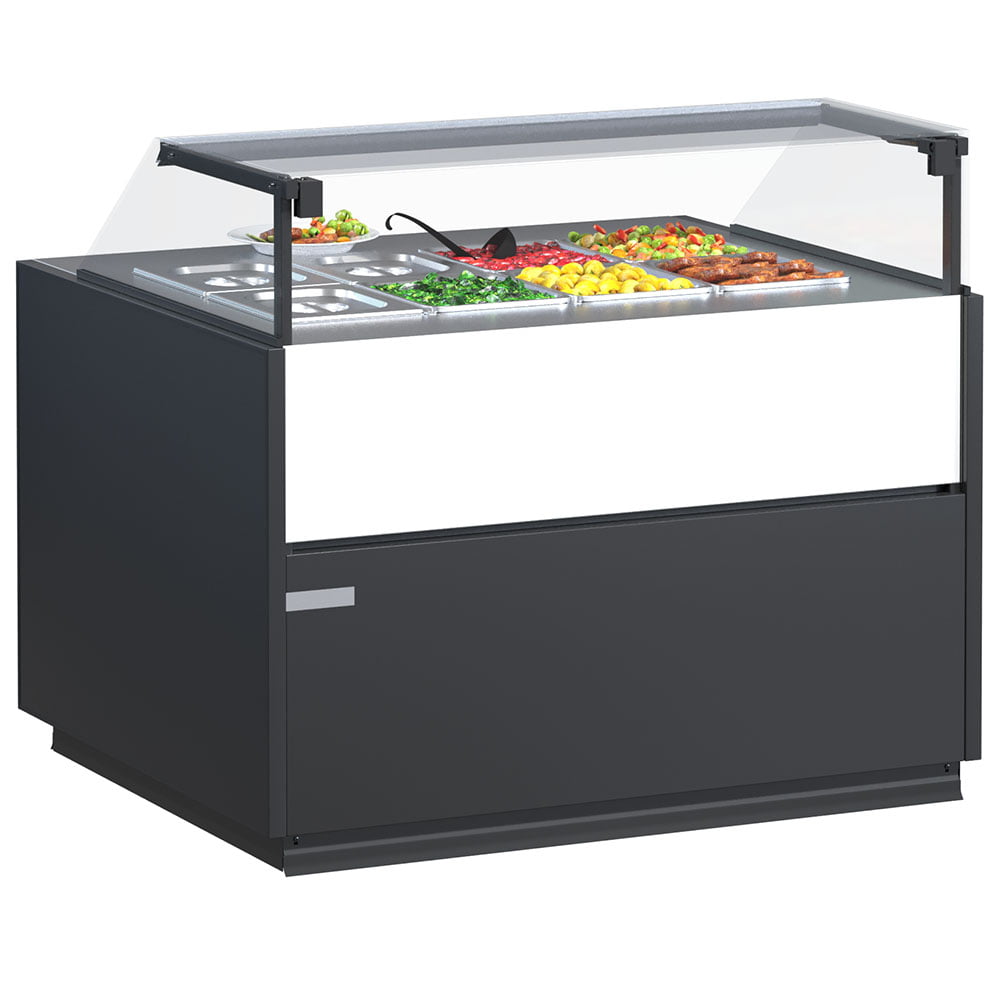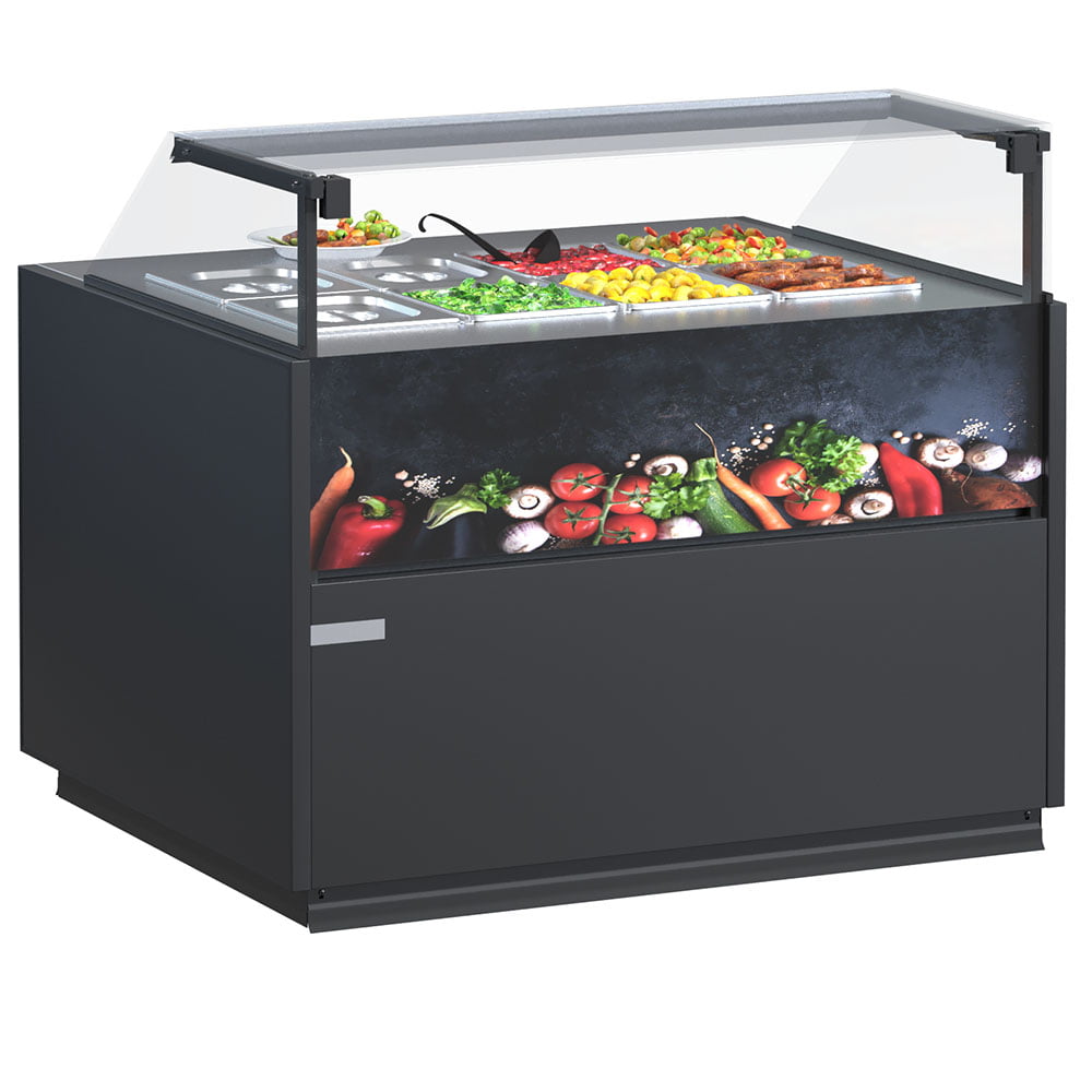 Витрина Quadros Warm — это тип напольной витрины, который позволяет сохранять готовые блюда теплыми в течение определенного времени. Такое оборудование подойдет для продажи продуктов как с помощью персонала, так и в режиме самообслуживания.