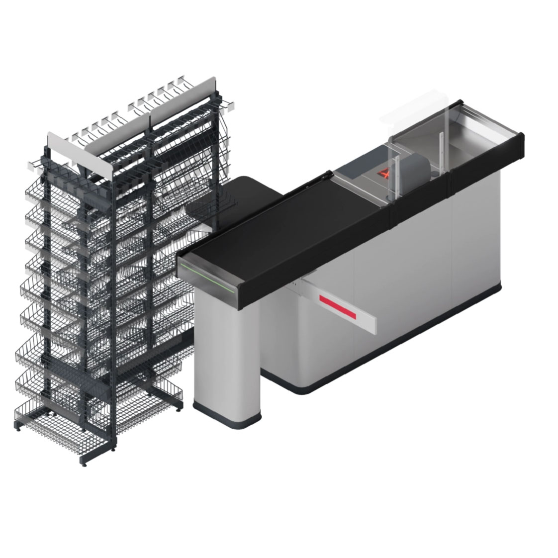 Прикассовый стеллаж торцевой металлический с многоуровневыми сетчатыми полками