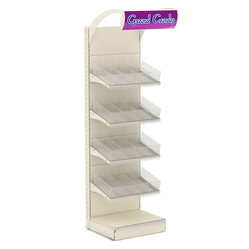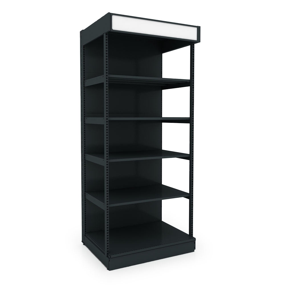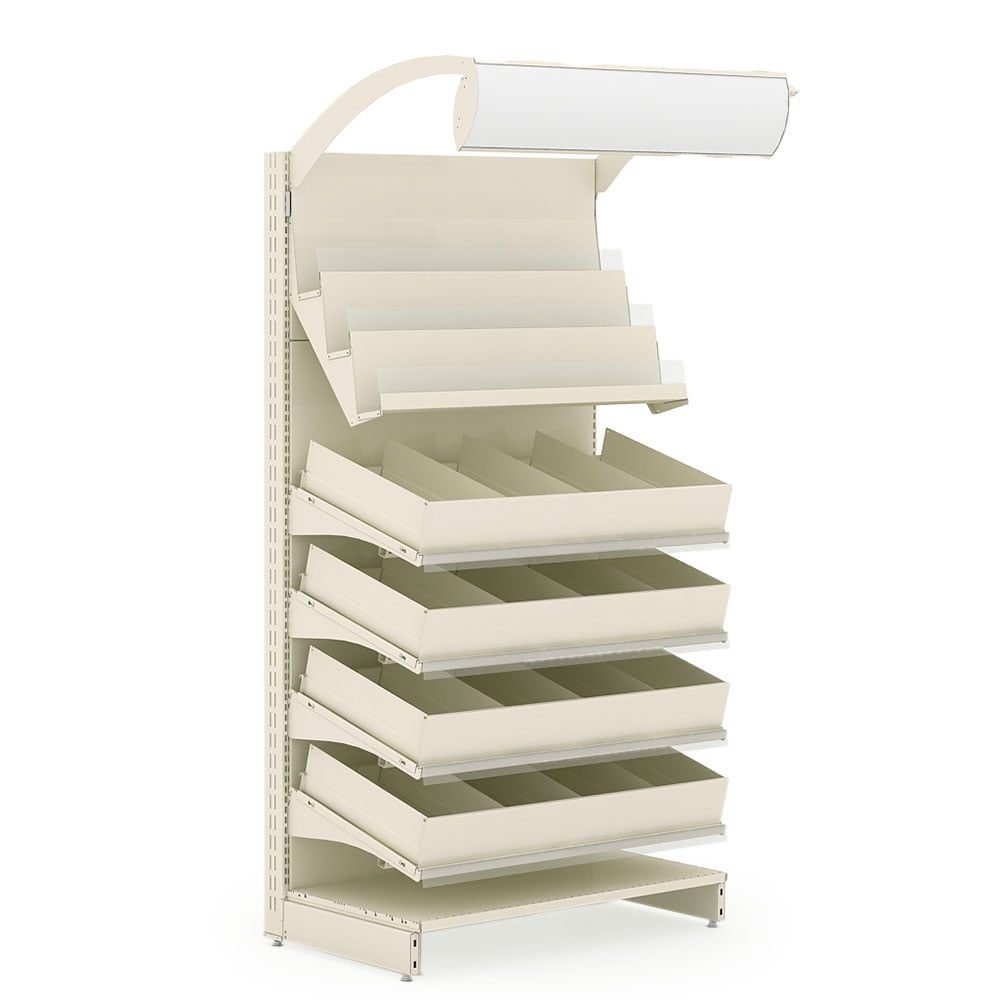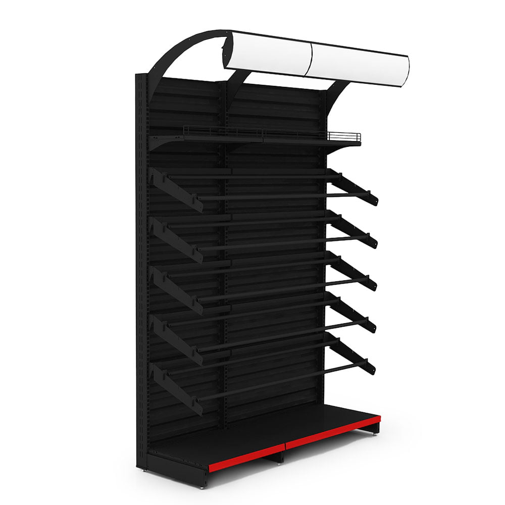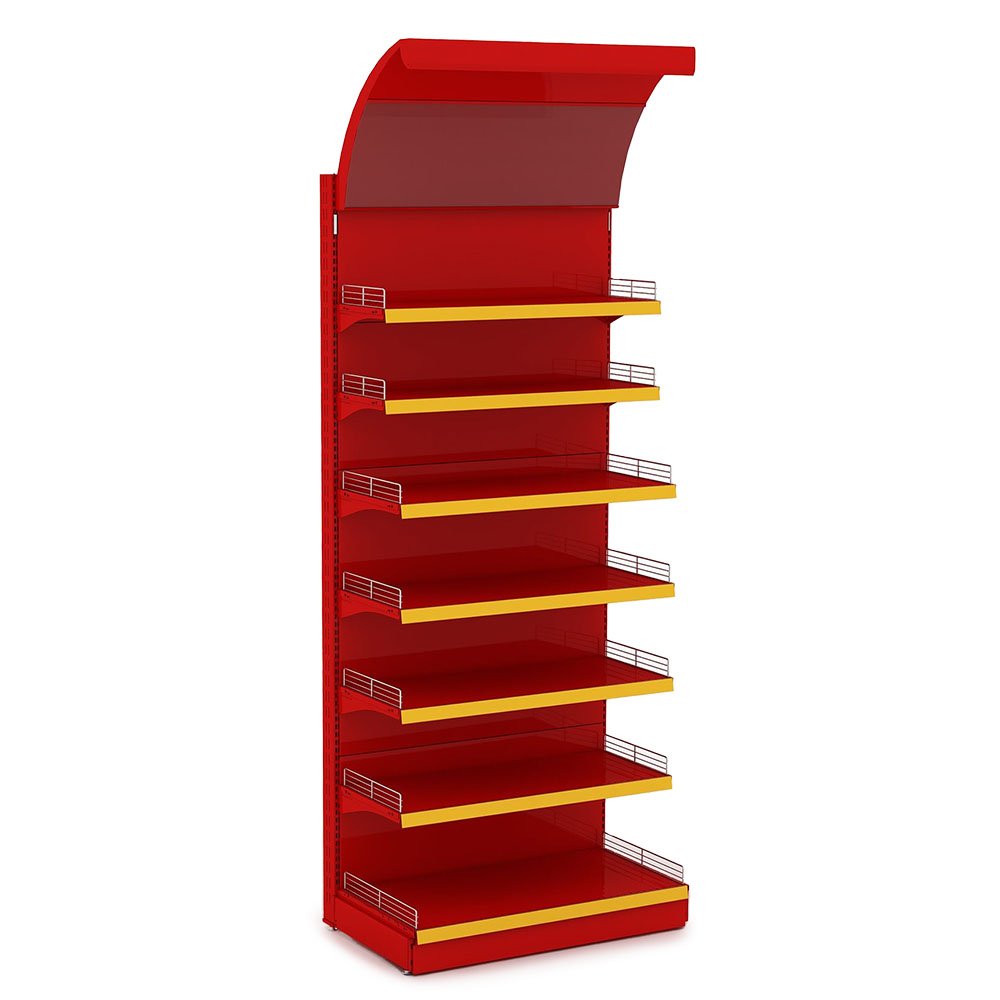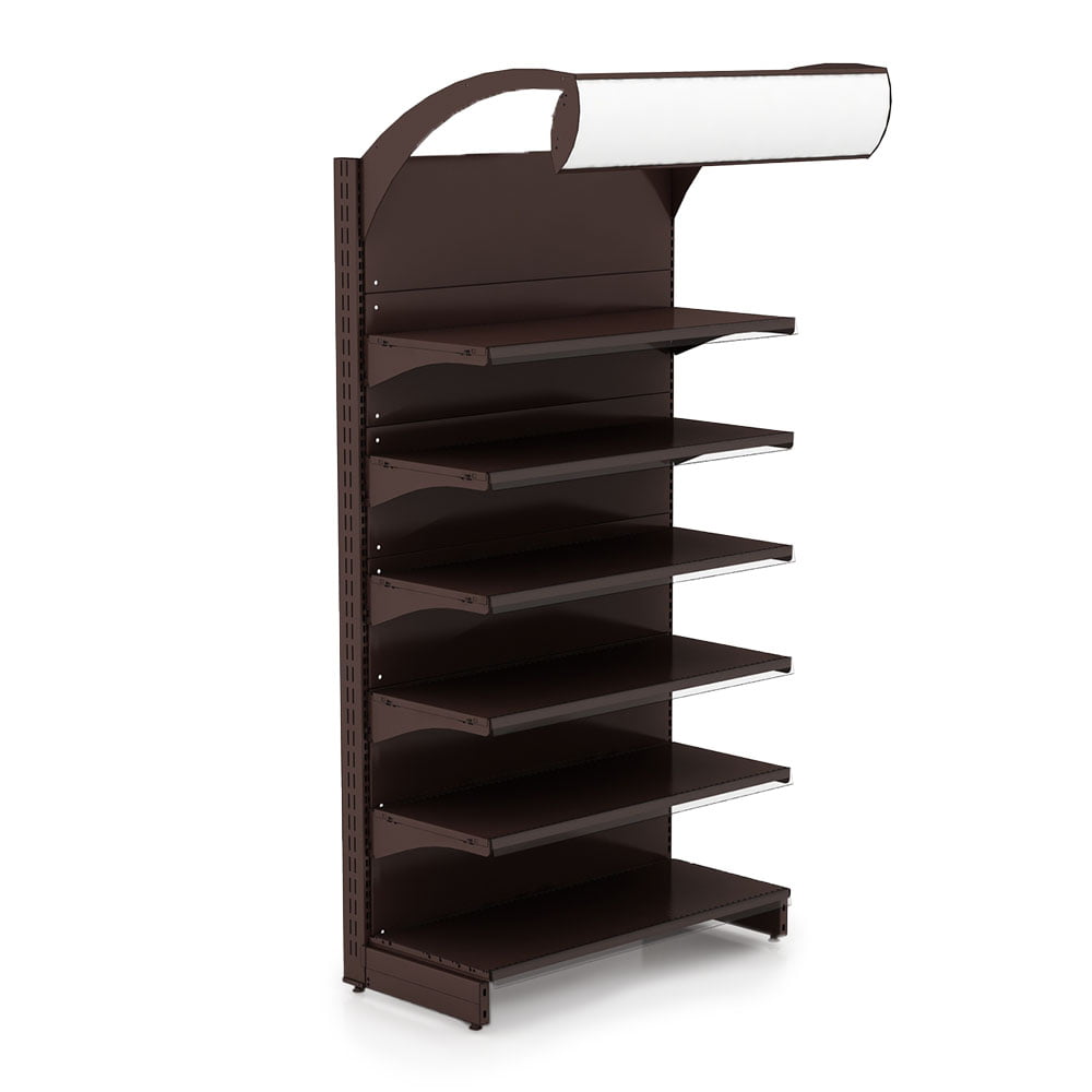 Данный вид стеллажа является простым и экономичным в эксплуатации, а также легкий в сборке и эксплуатации, не требует специальных знаний электрики при подключении. Фасад балдахина может быть выполненным в различных цветах, которые будут наиболее актуальными и подходящими под интерьер вашего магазина