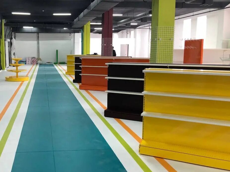 Низкие островные стеллажи помогают не перекрывать обзор, особенно в центральных проходах, тогда как высокие пристенные полки лучше разместить по периметру зала. Там можно хранить бытовую химию, консервы, продукты долгого срока деяния.