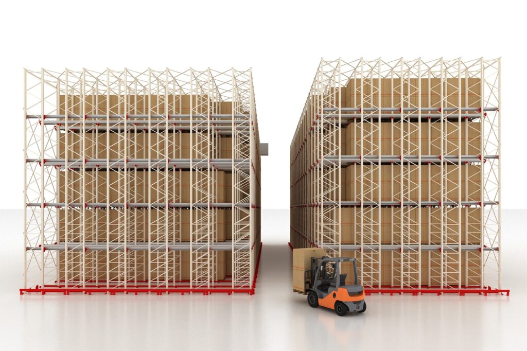 - Палетні стелажі — це класика. Вони ідеально підходять для великих об’ємів товару, розміщеного на піддонах. Їх використовують на логістичних хабах, складах дистриб’юторів, великих виробництвах. Головна перевага — доступ до кожної палети, швидкість завантаження/розвантаження та надійність при великих навантаженнях.